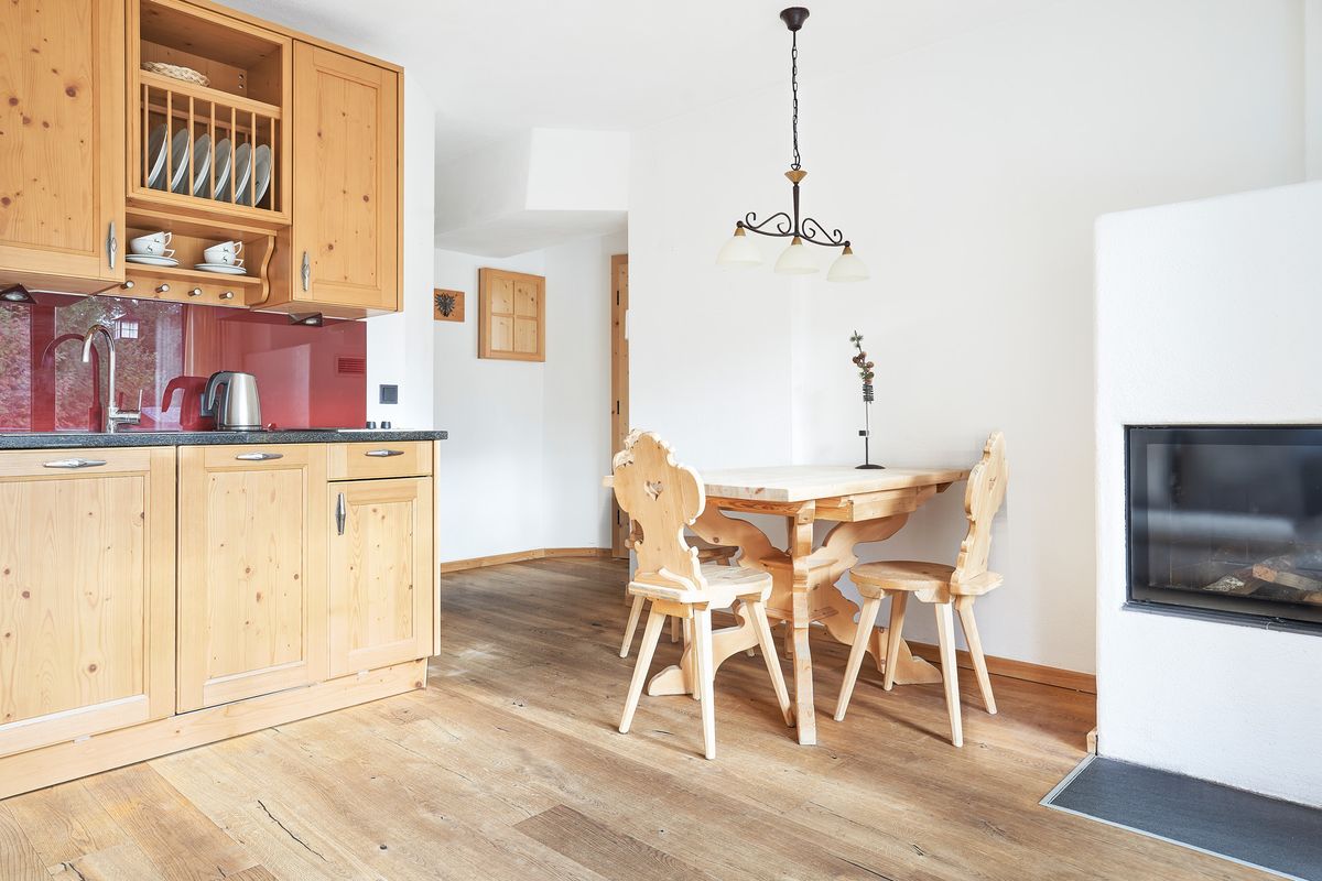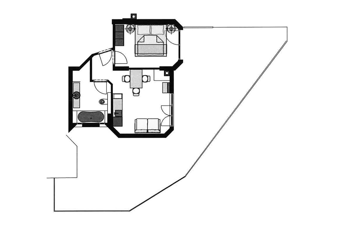 Der abgetrennte Wohnbereich ist mit einem verglasten Kamin, Fernseher sowie einer Küche mit Herd, großem Kühlschrank mit Gefrierfach, Mikrowelle, einer Kaffeemaschine, Toaster und Geschirrspüler ausgestattet. Im Schlafzimmer steht Ihnen ein Safe zur Verfügung. Das offen gestaltete Badezimmer verfügt über eine verglaste Dusche, Badewanne, Waschtisch, Föhn und WC.