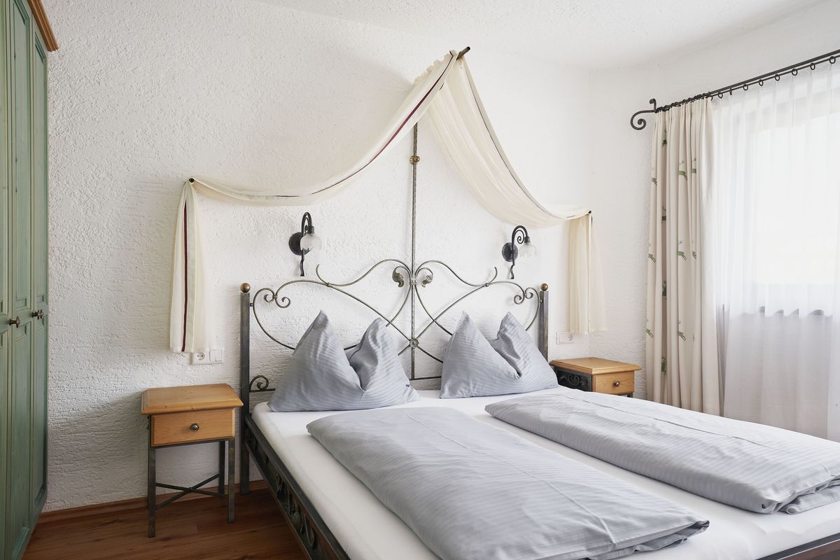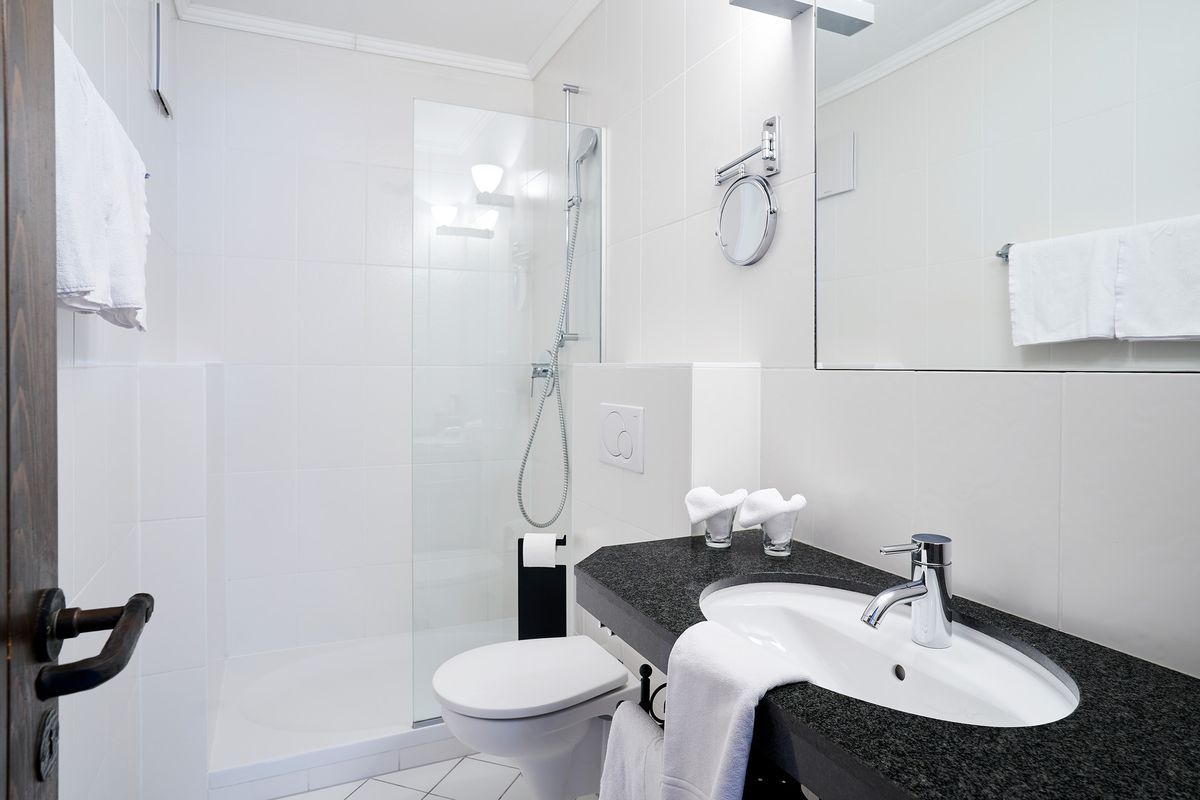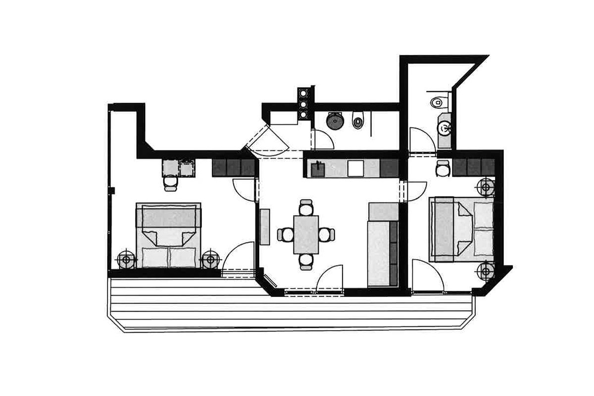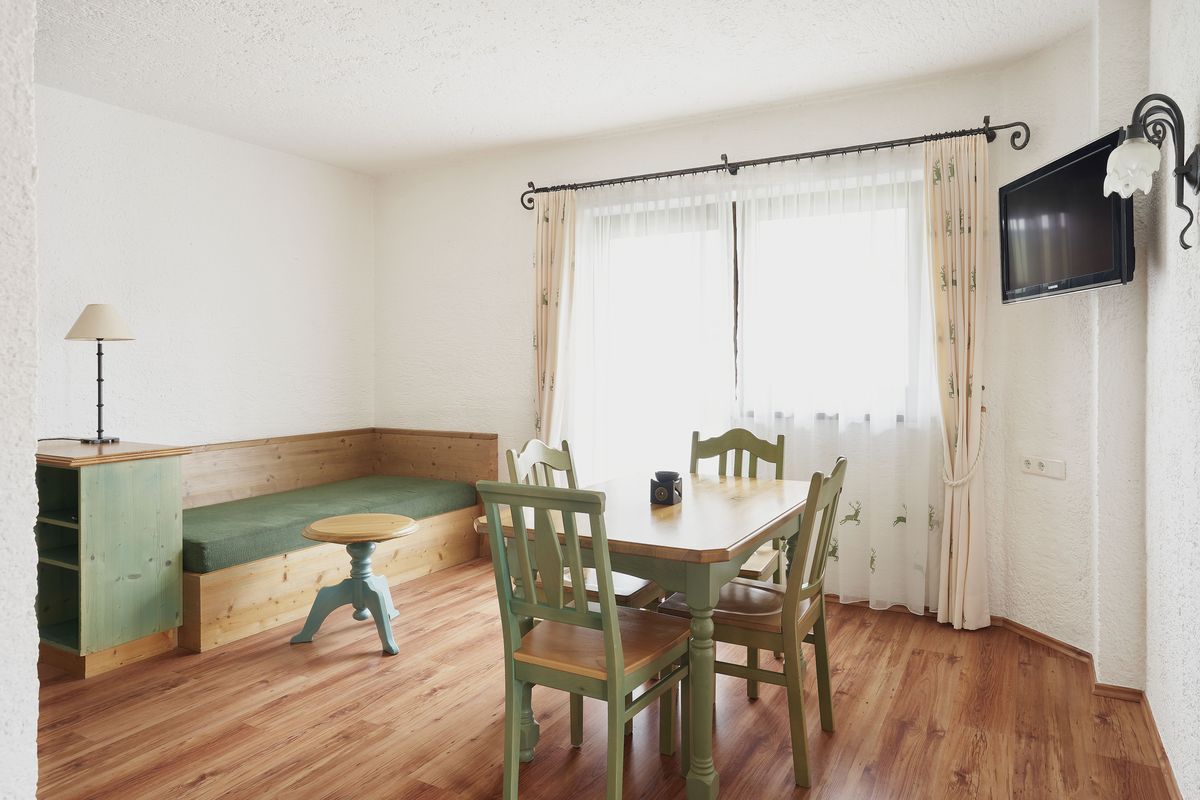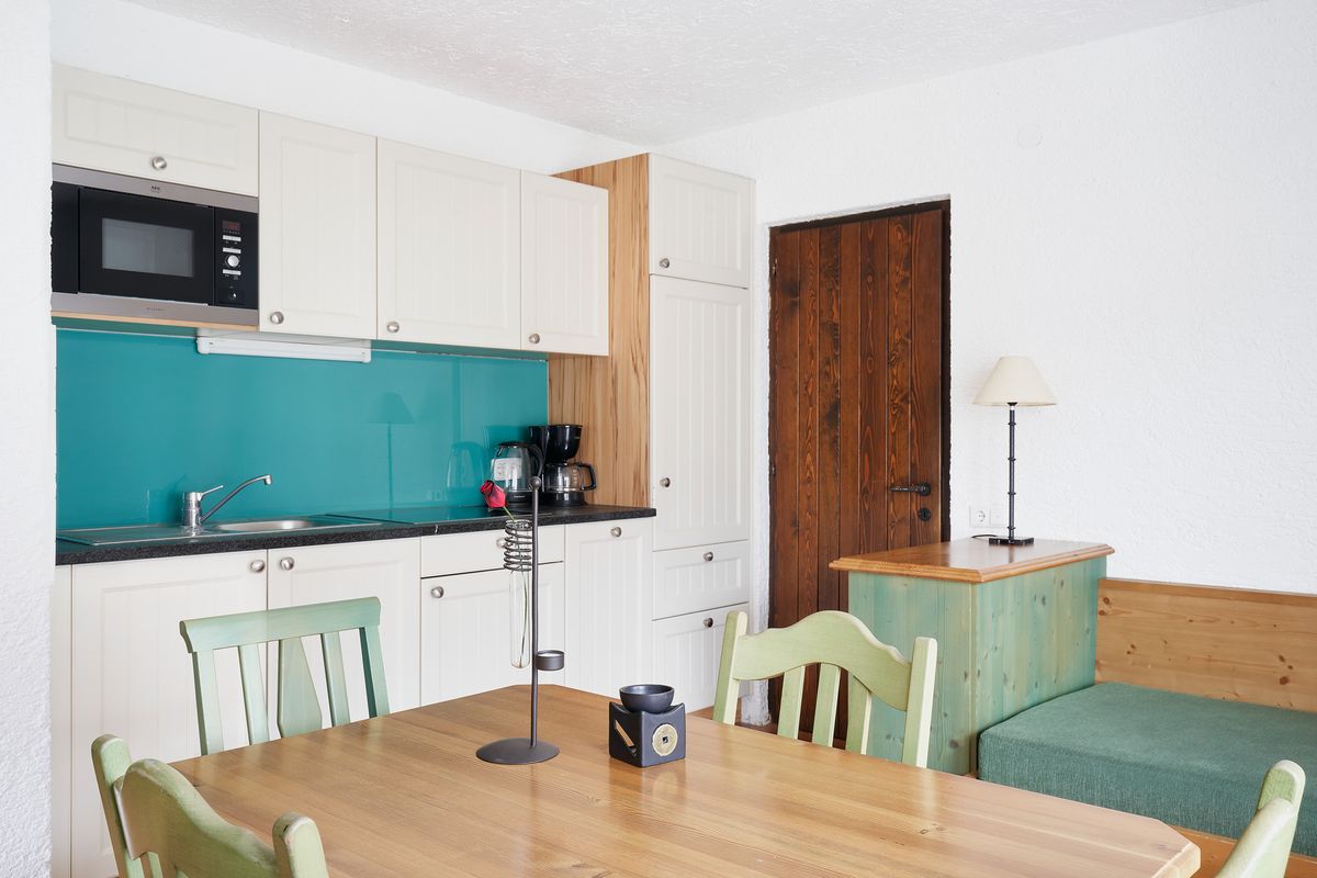 Je ein kleines Bad (jeweils ausgestattet mit WC, Waschtisch und verglaster Dusche) ergänzen die beiden Schlafzimmer, eine Terrasse mit Blick Richtung Ahrnspitze sowie einen kleinen Balkon mit Aussicht auf das Wettersteingebirge. Der abgetrennte Wohnbereich verfügt über einen Fernseher, die Küche ist mit Herd, großem Kühlschrank mit Gefrierfach, Geschirrspüler, Mikrowelle, Wasserkocher und einem Toaster ausgestattet. In den Schlafzimmern finden Sie jeweils einen Safe.
