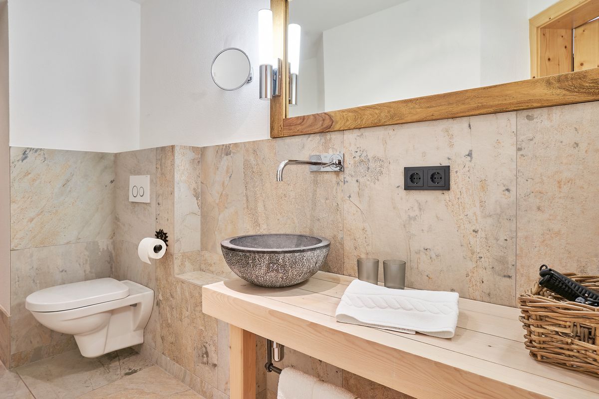 Das offen gestaltete Badezimmer verfügt über eine bodengleiche begehbare Dusche, Waschtisch, Föhn und WC.