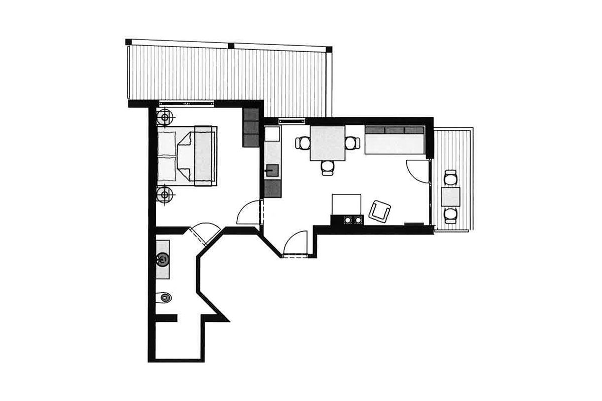 Der abgetrennte Wohnbereich mit Sichtdachstuhl und Flat-TV (inklusive Blu-Ray-Player) verfügt über einen verglasten Kamin sowie über eine Küche mit Herd, Kaffeemaschine, Mikrowelle, Geschirrspüler, Toaster und Kühlschrank mit Gefrierfach. Das Schlafzimmer mit zusätzlichem Balkon ist mit einem Safe ausgestattet.