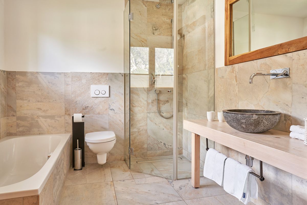 Das offen gestaltete, geräumige Badezimmer ist mit einer verglasten Dusche, Badewanne, einem Waschtisch, Föhn und WC ausgestattet.