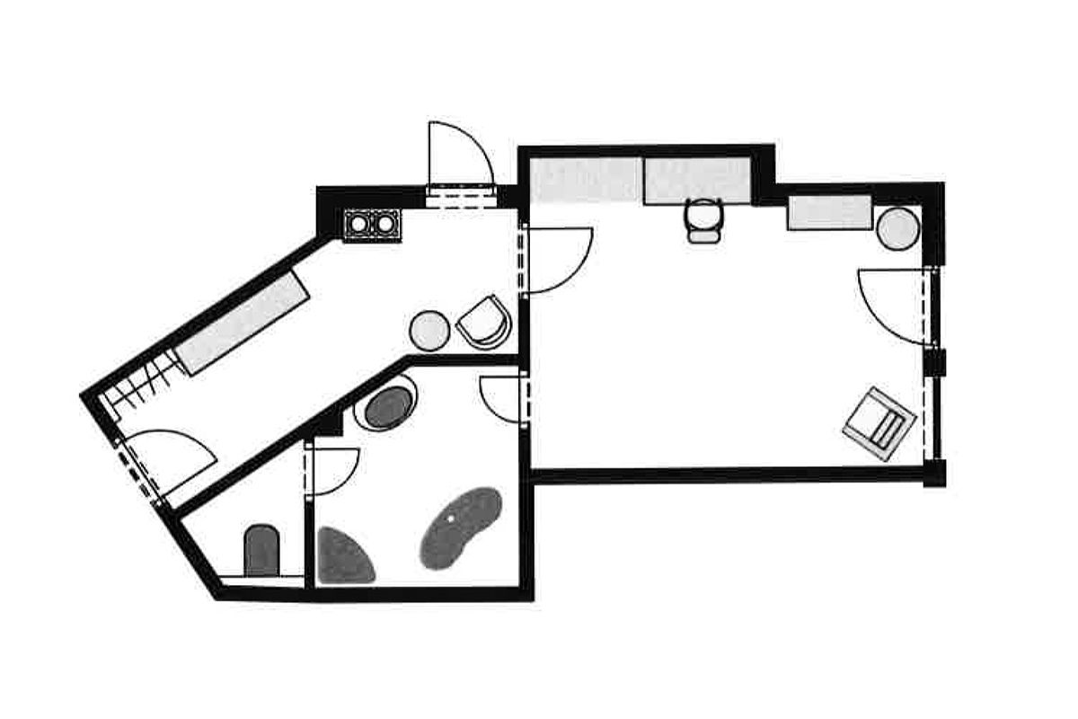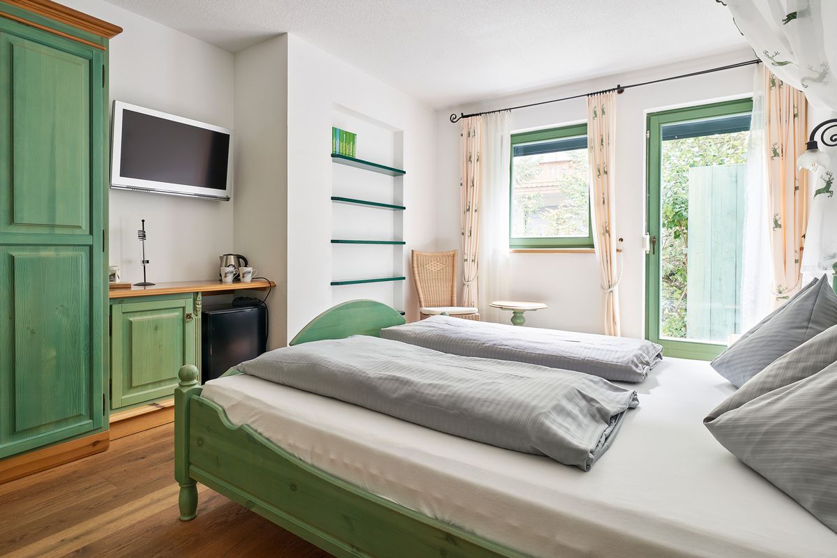 Das ca. 24 m² große ebenerdige Doppelzimmer mit einer kleinen Terrasse Richtung Süden, direkt am Mühlenbach gelegen.