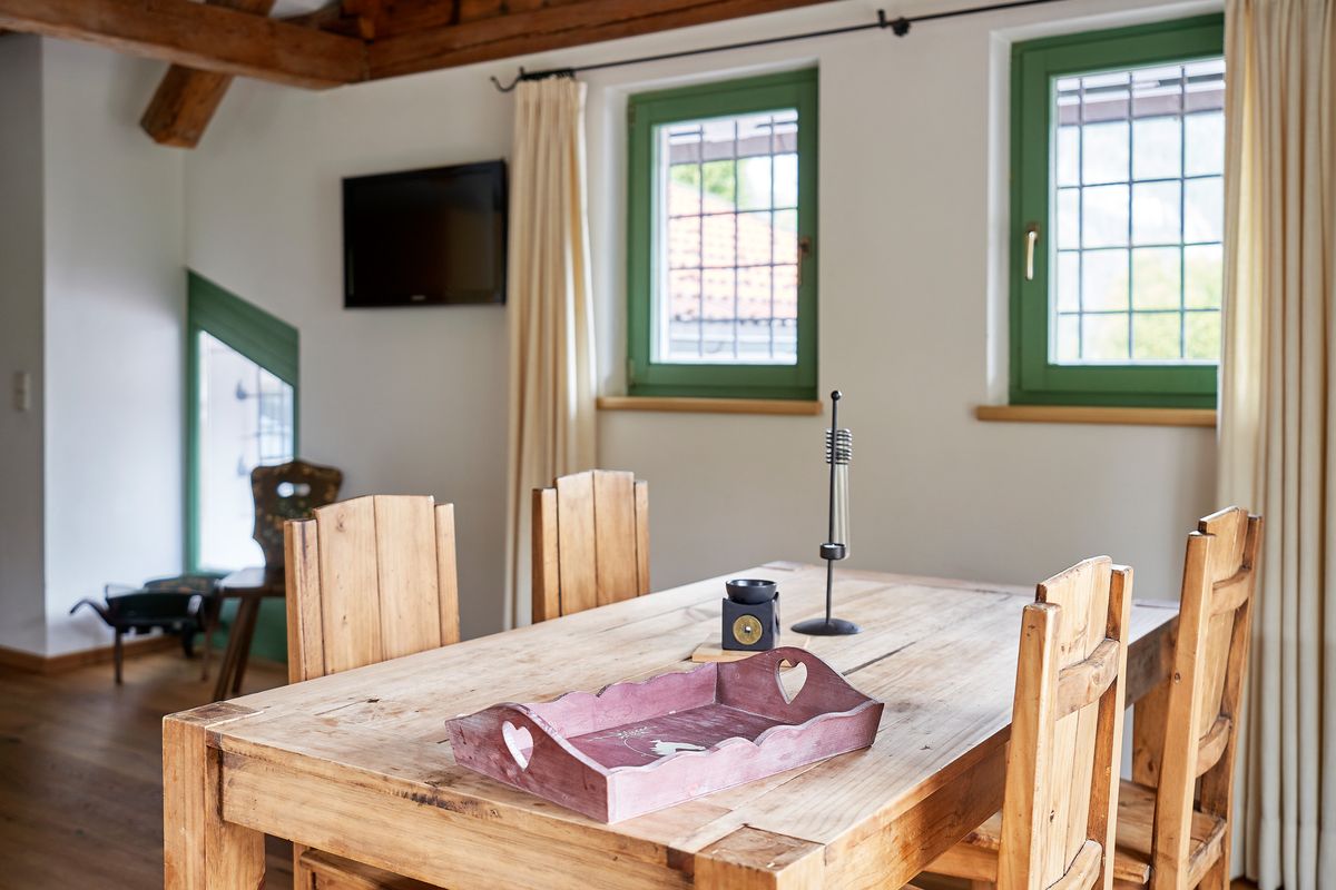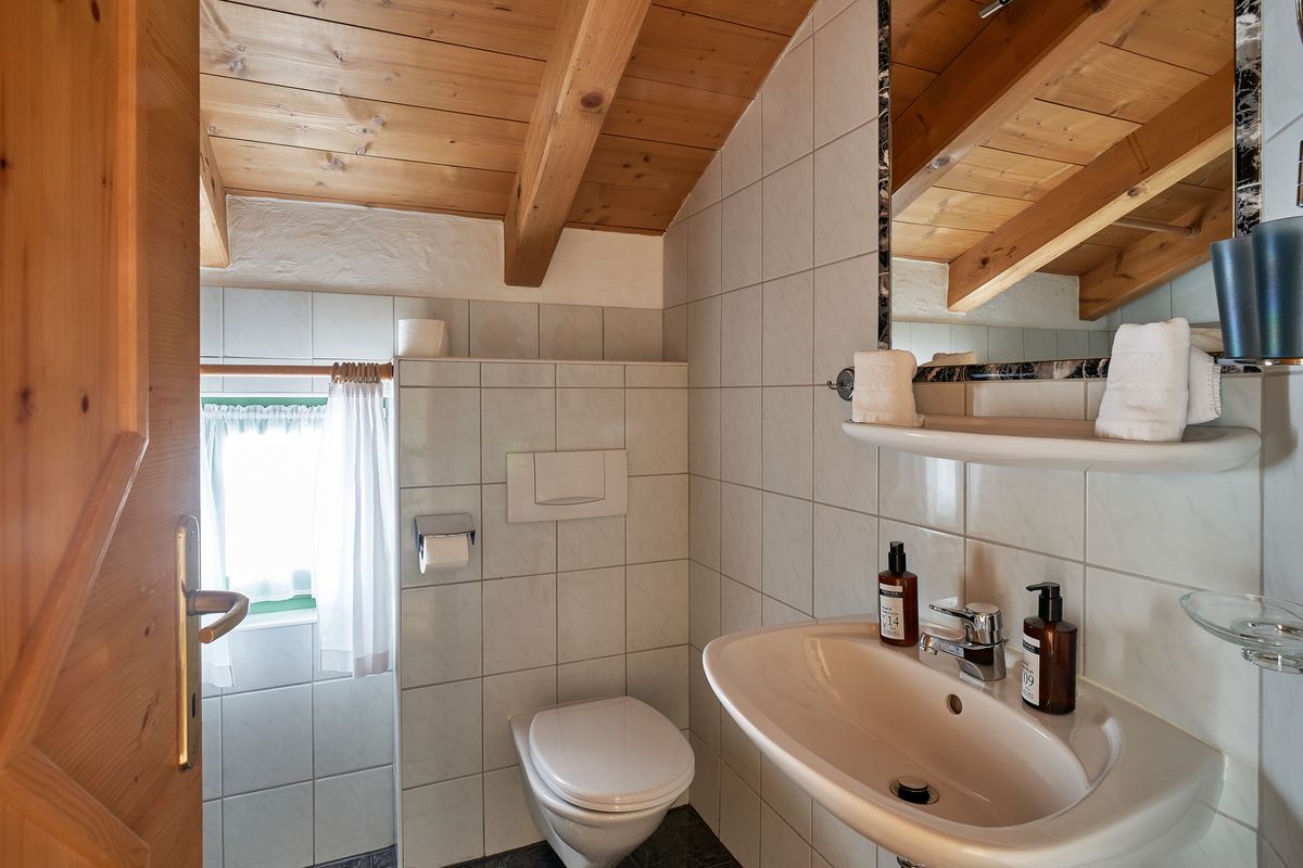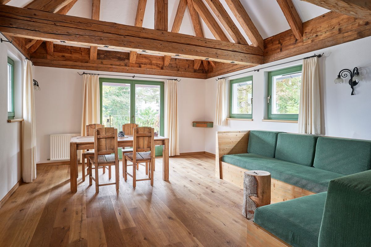 Der abgetrennte Wohnbereich mit Sichtdachstuhl ist mit einem Fernseher sowie mit einer Küche mit Herd, Kühlschrank, Geschirrspüler, Kaffeemaschine, Wasserkocher, Toaster ausgestattet. Das kleine Badezimmer in der Dachschräge verfügt über eine verglasten Dusche, Waschtisch und WC.