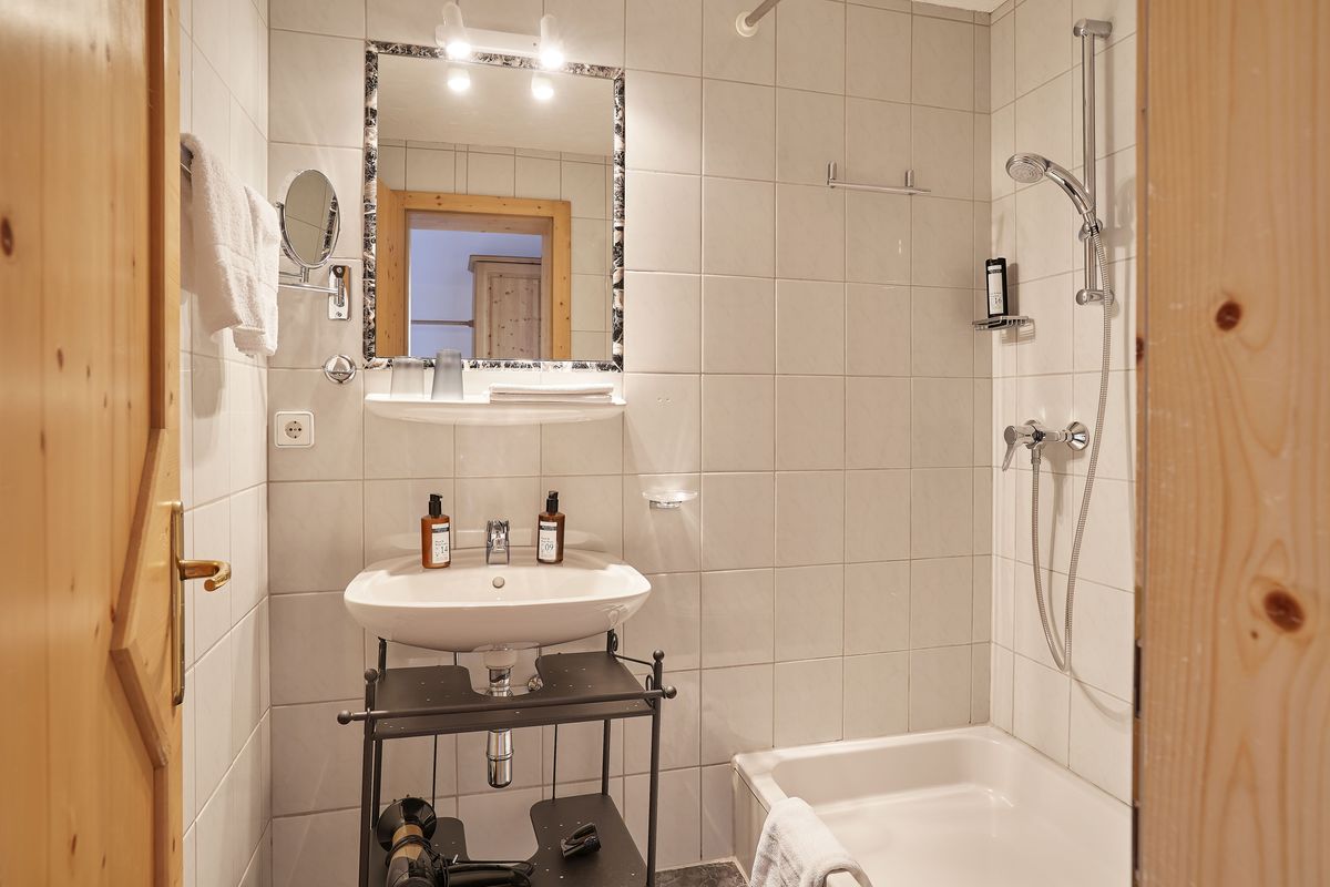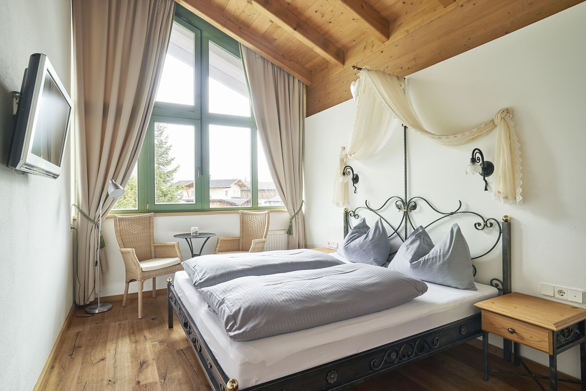 Unser ca. 20 m² kleines Doppelzimmer verfügt über eine große Fensterfront mit Blick auf das Wettersteingebirge und einen Sichtdachstuhl.