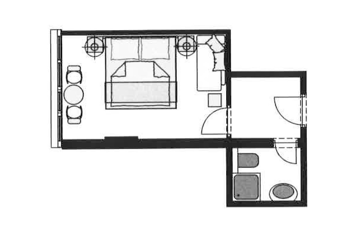 Das Zimmer verfügt über einen Fernseher, Minikühlschrank und Safe. Das kleine Badezimmer ist mit einer Dusche, einem Waschtisch und WC ausgestattet.